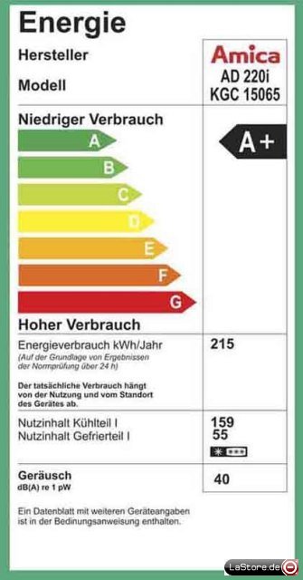 Ausführung 2-türig, Bauform Standgerät, Gehäusefarbe weiß, Farbe der Tür weiß, Dekorfähig nicht möglich, Anschlusswert 90 W, Nettofassungsvermögen Kühlzone 159 l, Nettofassungsvermögen Gefrierteil 55 l, Sternekennzeichnung 4, Breite 558 mm, Höhe 1440 mm, Tiefe 600 mm, Energieeffizienzklasse A+, Jahresenergieverbrauch 215 kWh, Klimaklasse N, Türanschlag rechts, Scharniere wechselbar, Anzahl der verstellbaren Ablagen 3, Nutzinhalt des Kühlfachs 159 l, Nutzinhalt des Gefrierfachs 55 l, Geräuschemission 40 dB