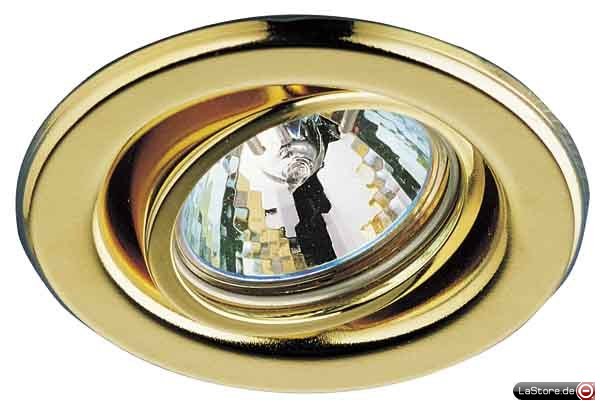 schwenkbarer NV-Einbaustrahler zur Wohnraumbeleuchtung, Material Eisen, Bestückung 1x12V/GX5,3 - max.50W, Schutzart (IP) 20, Einbautiefe 55mm, Außendurchmesser 82mm, Deckenausschnitt 68mm, Farbvariante gold