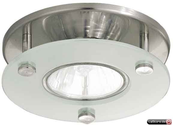 starrer NV-Einbaustrahler mit dekorativem Glasvorsatz, Material Eisen + klares Glas, Leuchtmittelwechsel ohne Sprengring, Bestückung 1x12V/GX5,3 - max.50W, Schutzart (IP) 20, Einbautiefe 35mm, Außendurchmesser 95mm, Deckenausschnitt 70mm, Farbvariante nickelmatt