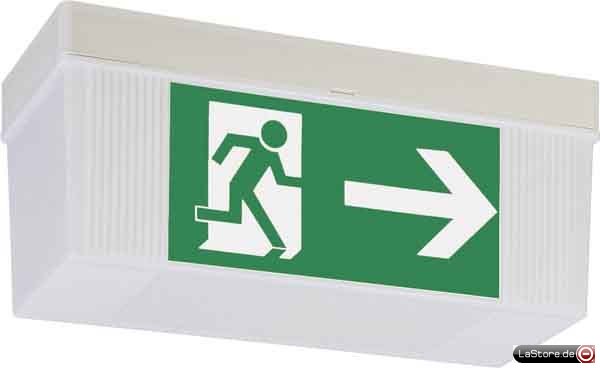 Einzelbatterie-Sicherheitsleuchte zur Rettungswegkennzeichnung oder Rettungswegbeleuchtung, Unterteil Kunststoff weiß (Polycarbonat), Abdeckung Kunststoff opal, Kombifolie mit Rettungszeichen beigelegt, Lampe im Lieferumfang enthalten, Prüftaster eingebaut, Schaltungsart: wahlweise in Bereitschaftsschaltung (B) oder Dauerschaltung (D) anschließbar, Erkennungsweite 21 m (bei Wand- oder Deckenmontage)