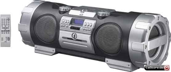BoomBlaster, Musikleistung: 2x 10 W + 2x 20 W (Super-Woofer), CD-Player (CD-R/RW & MP3 kompatibel) mit ID3-Tag, eingebauter Gitarrenverstärker, Audio-Eingang für Gitarre/Mikrofon/MP3-Player, regelbare Doppel-Super-Woofer mit 16 cm Chassis, elektronisches Kassettenlaufwerk mit Auto-Reverse, Digital-Tuner, inkl. Tragegurt, 2 Taschen für Fernbedienung/MP3-Player sowie Anschlusskabel für MP3-Player
