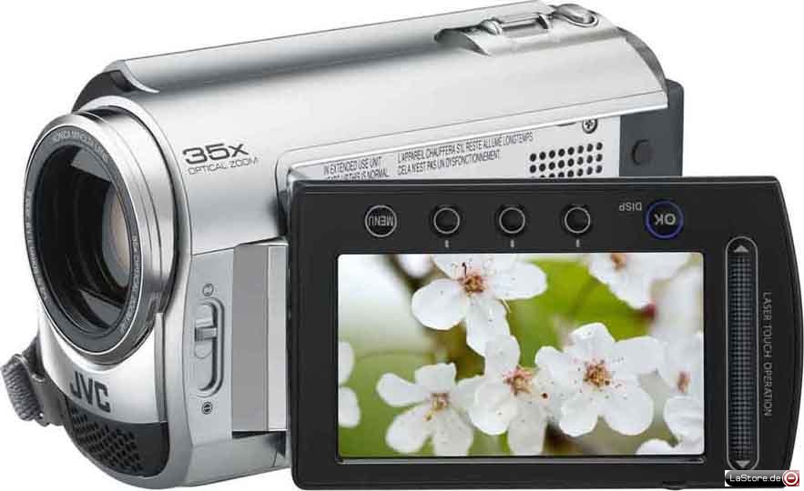 Schlanker, eleganter HDD/microSD Camcorder mit Konica Minolta Objektiv, 35fach optischem Zoom, Laser Touch Operation für eine einfache Menüauswahl und einer 30 GB-Festplatte für bis zu 37,5 Stunden Langzeitaufnahme.