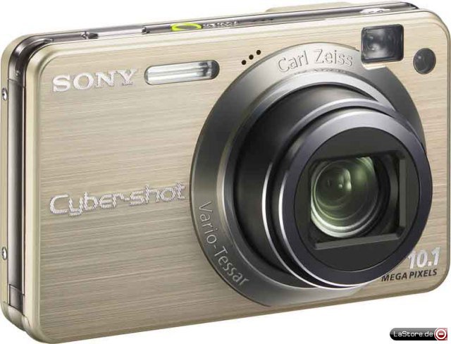 Cyber-shot mit Carl Zeiss Vario-Tessar Zoom-Objektiv, doppelter Verwacklungsschutz (optisch und ISO), 2,7-Zoll-Farb-LCD-Display, Gesichtserkennungs-Technologie, Smile Shutter, Fotonachbearbeitung in der Kamera, intelligente Motiv-Erkennung, MPEG Movie VX fine 640x480, 12 Programmautomatiken, Einfach Menü, Multi-Systemanschluss (AV/USB inkl. PictBridge Unterstützung), HD-Ausgang, Abmessungen (BxHxT): 93,7x58x24 mm, inkl. Zubehör (Lithium-Ionen Akku, Ladeadapter, USB-/AV-Systemkabel, Softwarepaket, Handschlaufe), Farbe: Gold