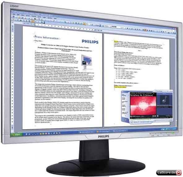 Dieser superflache Philips 220AW8 fördert Ihre Geschäftsproduktivität durch hohe Auflösung, gut lesbare Schriftgröße, eine größere Bildfläche und eingebaute Lautsprecher.