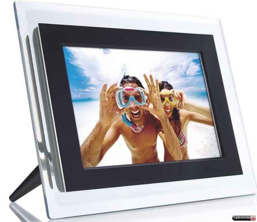 7" LCD PhotoFrame, bis zu 13 Megapixel, klare Farben, Anzeigen von Diashows, Einzelfotos, Miniaturansichten und Uhrzeit, USB-Anschluss, autom. Ein- und Ausschalten des Displays zur Energieeinsparung (Smart Power), Maße (BxHxT): 159x207x105 mm (inkl. Fuß)